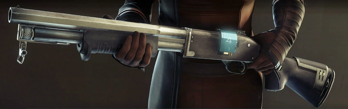 Le fusil à pompe pouvant être trouvé à bord de Talos I et au sein de Pythéas est une arme de sécurité classique. Comme l'ensemble des fusils à pompe, il est très efficace à courte portée, mais perd de sa puissance à longue portée. Un écran sur le côté de l'arme permet de suivre l'utilisation du chargeur et des réserves de munitions.